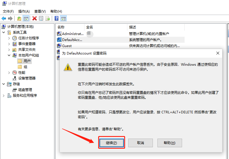 我们点击设置密码选项后会弹出一个提示信息窗口,我们点击“继续”。