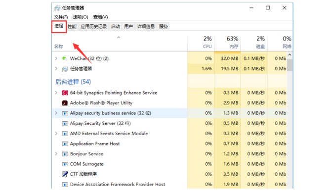 2、 打开任务管理器后,点击选择“进程”,如下图所示