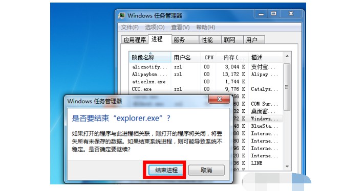 4、 弹出确认窗口时,点击“确定”,这时候系统桌面所有图标都会消失,不用担心,我们马上进行修复