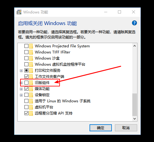 2、在Windows功能设置中,找到并展开“旧版组件”,然后勾选“DirectPlay”功能,完成后,点击下方的“确定”,如图。
