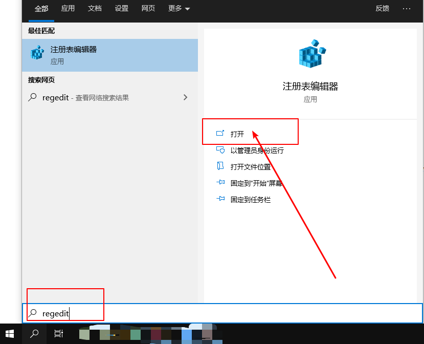 3、在Cortana搜索栏输入regedit后按回车键打开注册表编辑器,定位到: