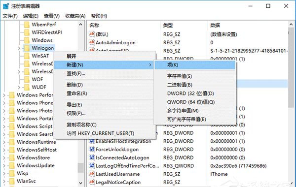 并右键Winlogon单击选择新建“项”,命名为SpecialAccounts;