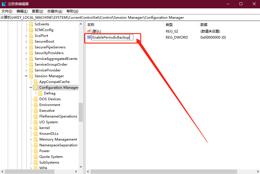 5、将DWORD(32位)值命名为“EnablePeriodicBackup”