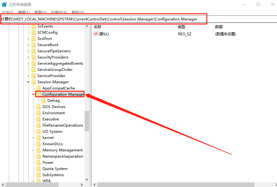 3、随后继续按照以上方式展开【SYSTEM\CurrentControlSet\Control\Session Manager\Configuration Manager】 并找到“Configuration Manager”文件夹