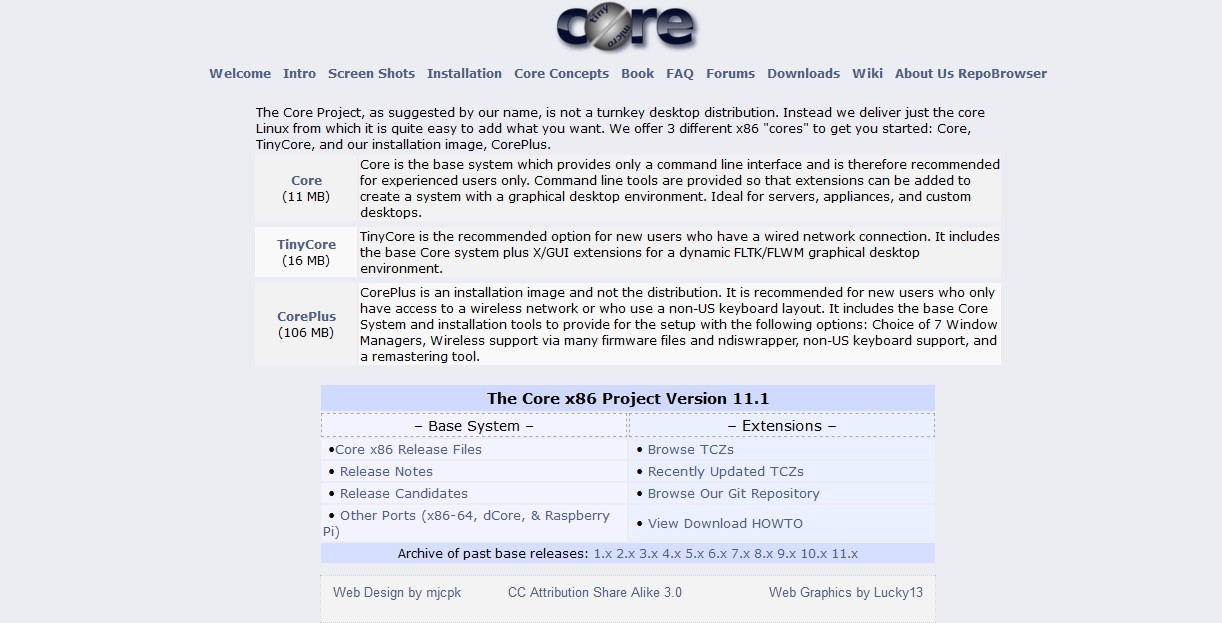 系统镜像一共有3款,命令行版Core (11MB)、图形结面板Tiny Core (16MB) 以及功能更加丰富的Core Plus (106MB)。