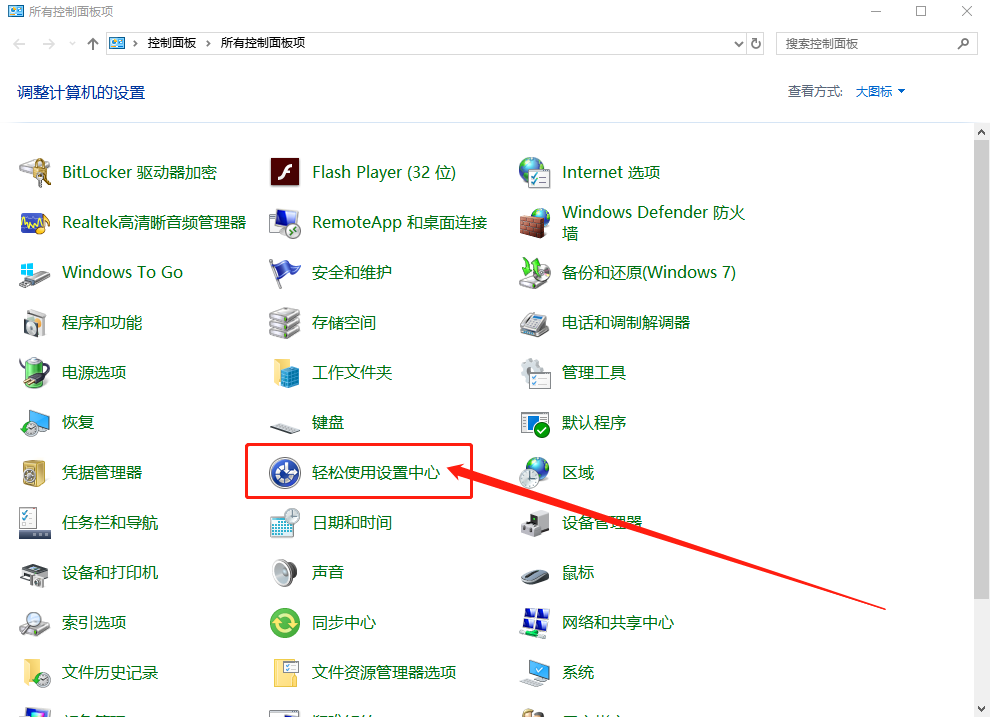 2、随后,在控制面板中点击“轻松使用设置中心”