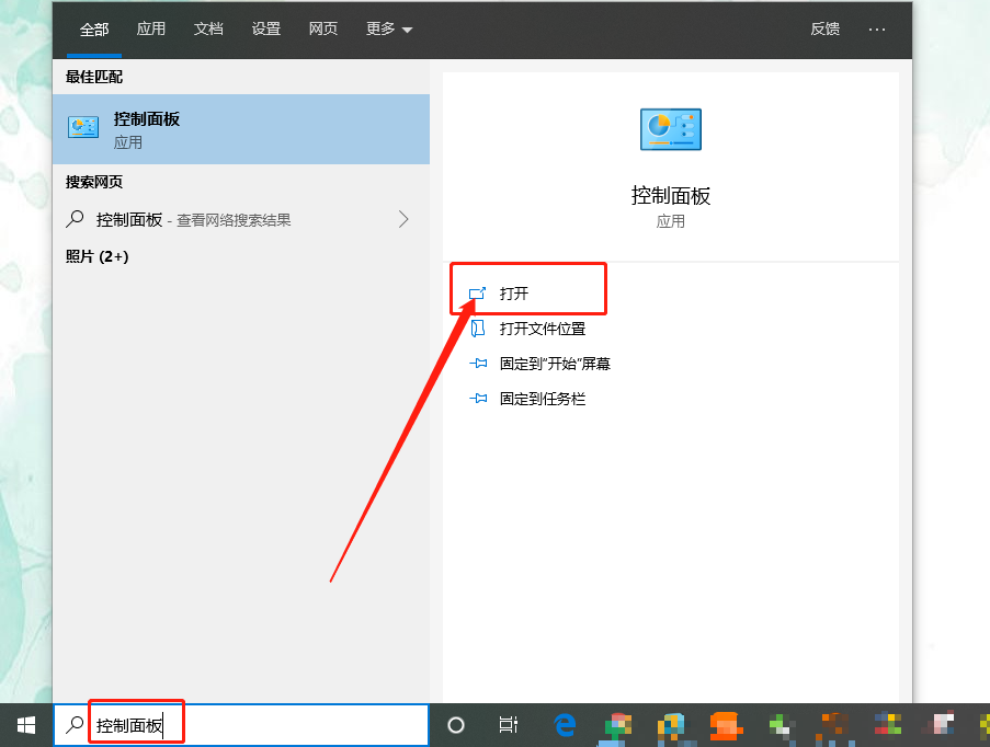 1、在桌面左下角输入“控制面板”并点击“打开”