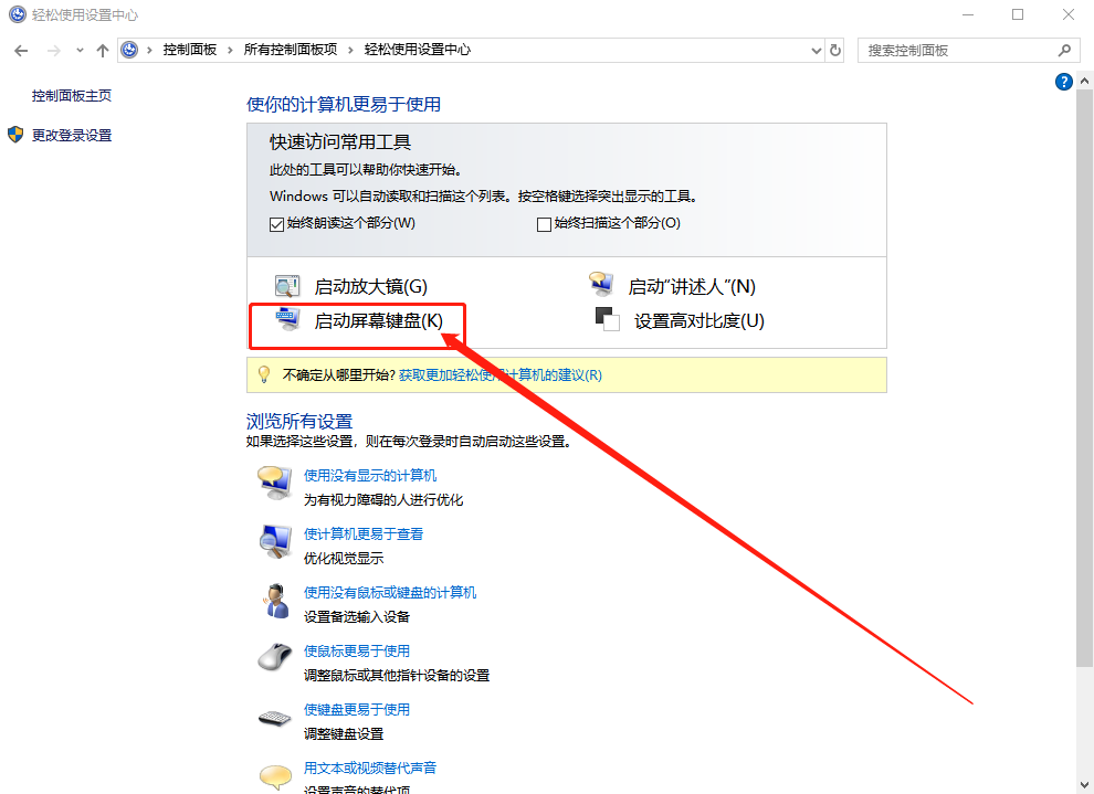 3、进入设置中心后 ,点击“启动屏幕键盘”即可