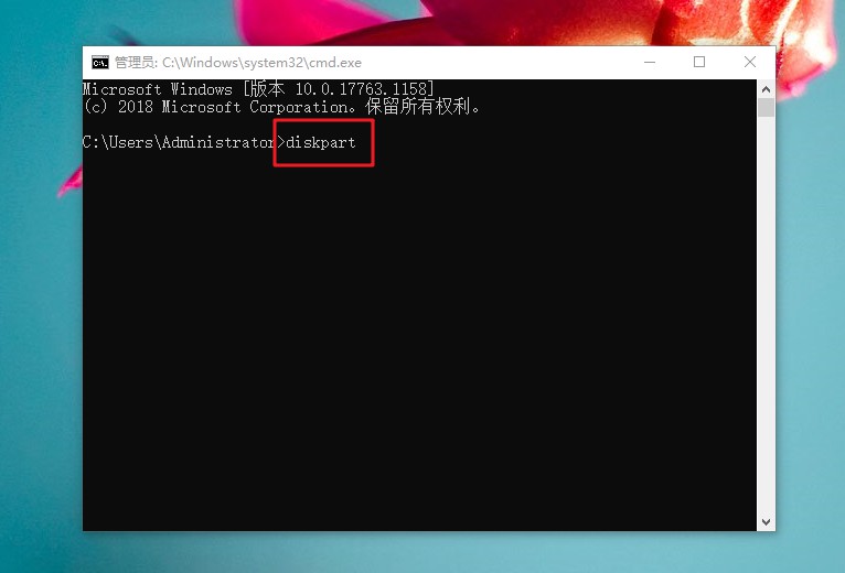 2、 然后,如图所示,输入【diskpart】,按回车执行命令