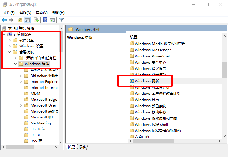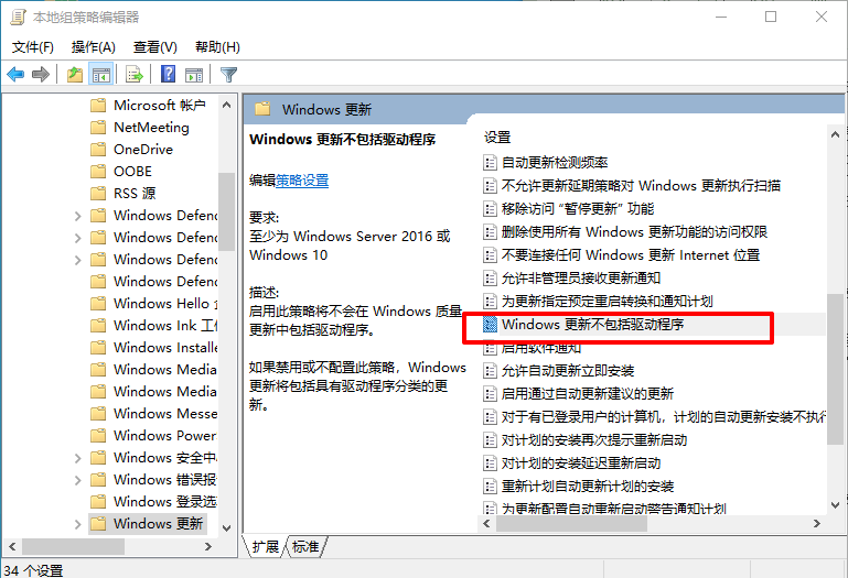 2、依次找到“计算机配置→管理模板→Windows组件→Windows更新”,然后找到“Windows更新不包括驱动程序”