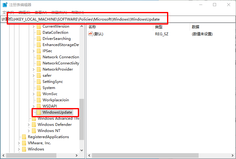 2、依次定位到【HKEY_LOCAL_MACHINE\SOFTWARE\Policies\Microsoft\Windows\WindowsUpdate】