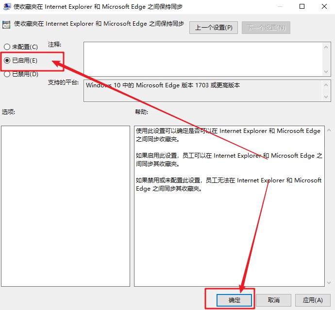 3、弹出一个新的窗口时,选中“已启用”,然后点击“确定”即可,之后你的收藏夹就可以在Microsoft Edge和Internet Explorer之间保持同步了。
