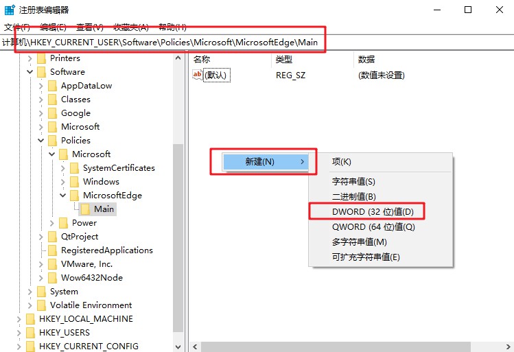 5、继续点击选中新建的Main项,在右侧窗口的空白处,右键选择“新建-DWORD(32位)值”并命名为“SyncFavoritesBetweenIEAndMicrosoftEdge”;