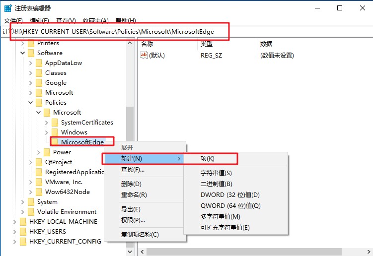 3、之后,在Microsoft文件夹中,找到并点击选中Microsoft项,右键选择“新建-项”,并命名“MicrosoftEdge”;