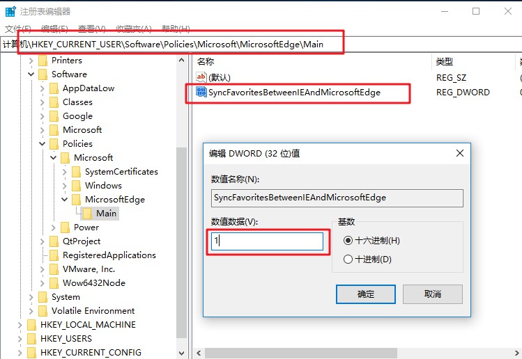 6、最后,双击新建的SyncFavoritesBetweenIEAndMicrosoftEdge的DWORD(32位)值,将数值数据设置为【1】,点击“确定”并重启电脑即可。