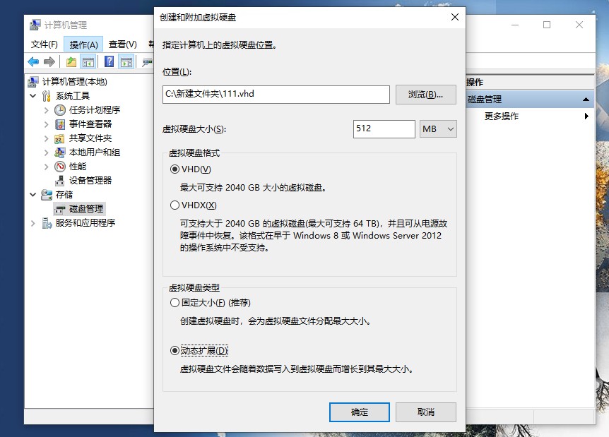 其中虚拟硬盘类型,截图中选择的动态扩展可以减少第一次创建虚拟硬盘时耗费的时间。而虚拟硬盘格式可按自己的需求选用,两者都可以使用。