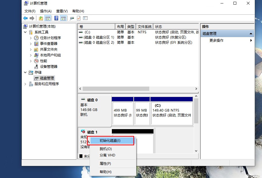 4、当创建完成后,右键新创建的虚拟硬盘,选择“初始化磁盘”。