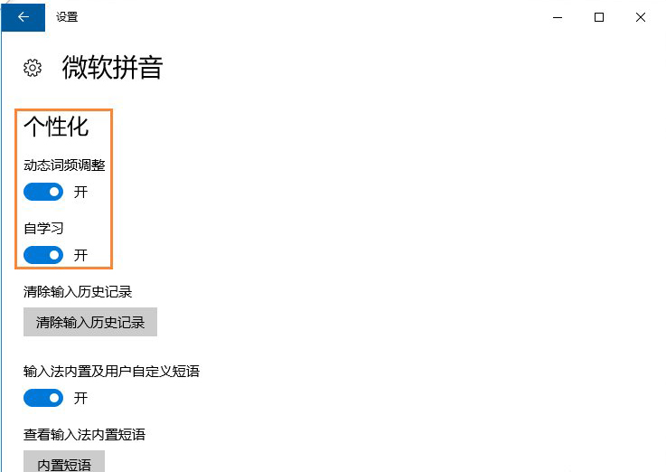 7、然后在个性化中,将“动态词频调整”和“自学习”功能打开即可