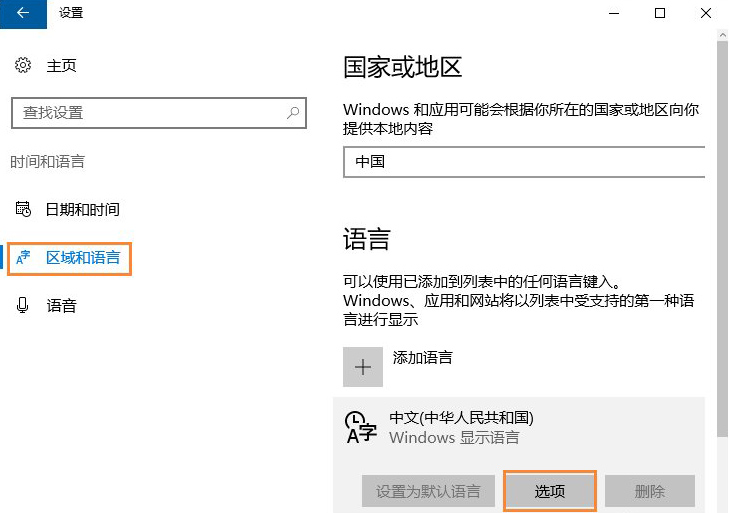 5、之后,先点击 “区域和语言”,再点击右侧的“中文”/“选项”