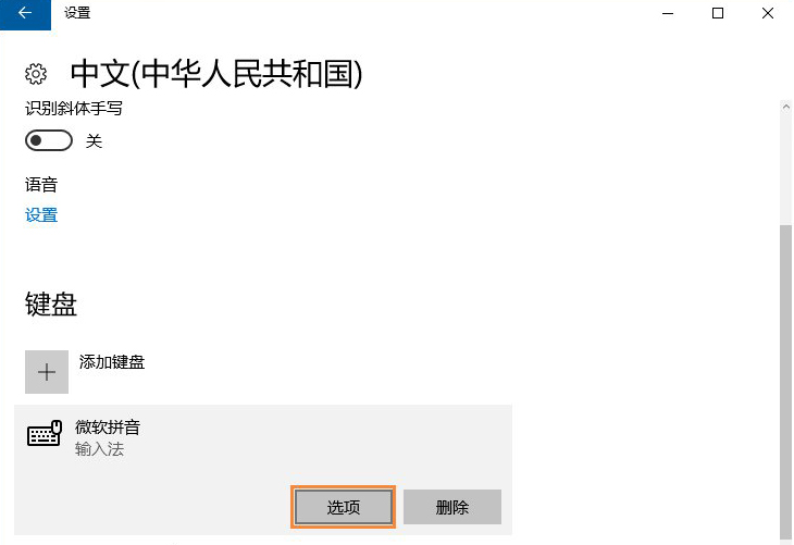 6、进入中文设置页面后,点击“微软拼音输入法”的“选项”