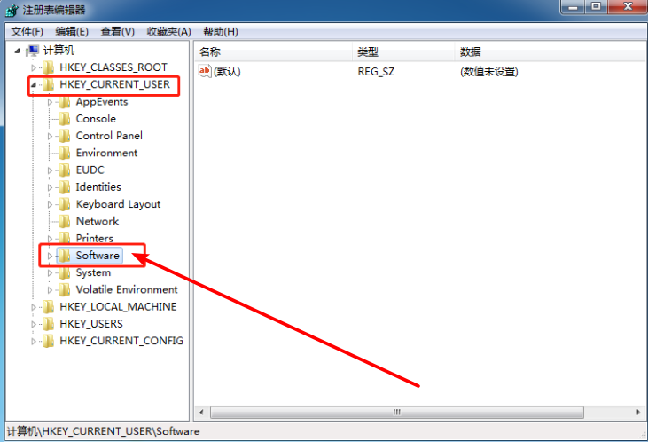 2、在注册表里,左键双击名为“HEKY_CURRENT_USER”的文件夹,在它的子目录里再双击“Software”