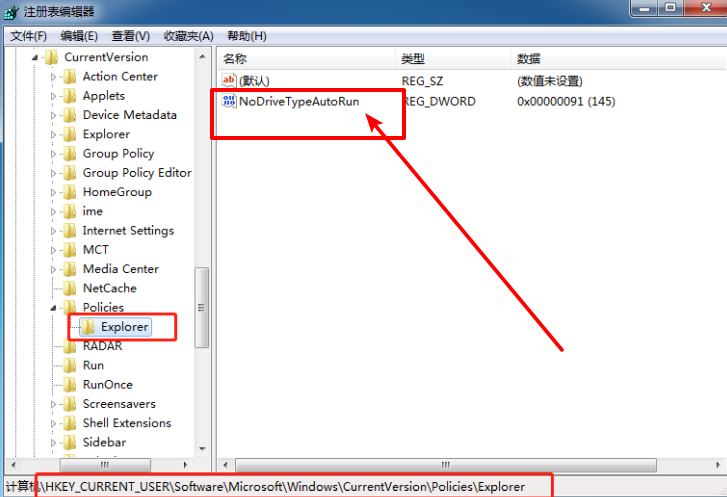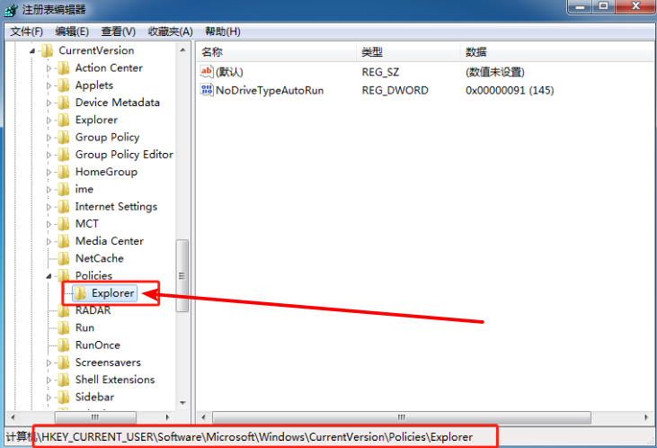 3、随后,按照这个方式,依次点击“Microsoft”-“Windows”-“CurrentVersion”-“Policies”-“Explorer”文件夹
