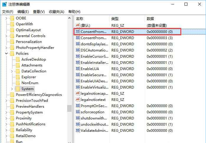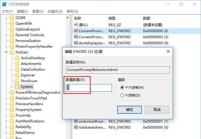 3、然后,在右侧找到并双击【ConsentPromptBehaviorAdmin】值,将数值数据修改成【3】