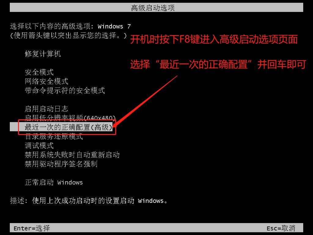 如果担心自己操作不来的话,也可以选择重启电脑,在开机画面出现的时候按F8键,选择【最后一次正确配置】或者选择【修复计算机】