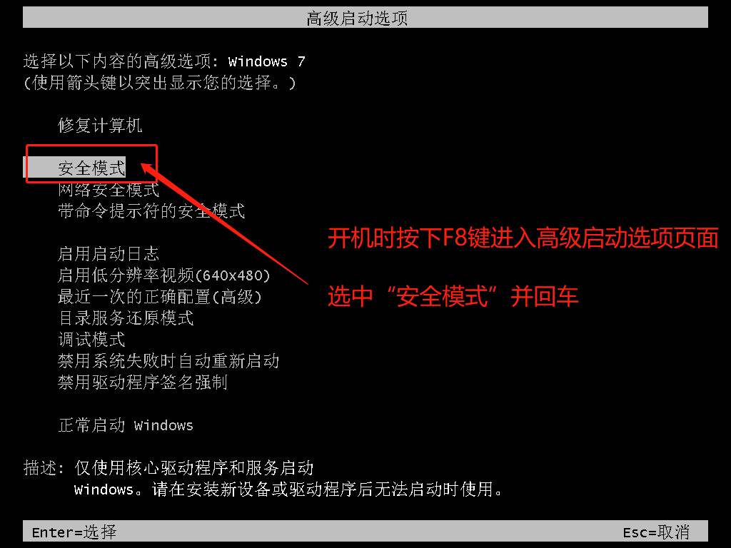 首先,在电脑开机或重启时按 F8 键,进入高级启动界面,选择“安全模式”,将系统进行杀毒。