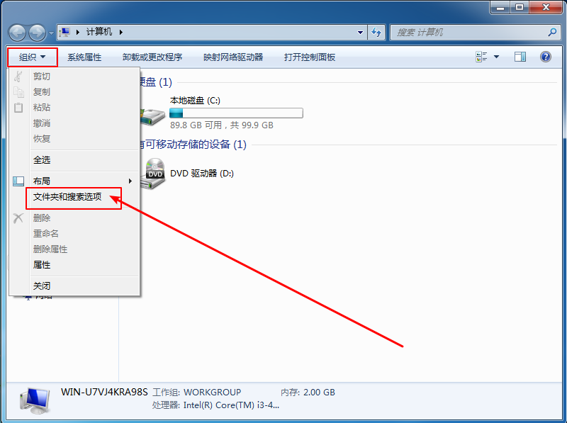 2、 然后,点击页面左上角的“组织”,并选择打开“文件夹和搜索选项”