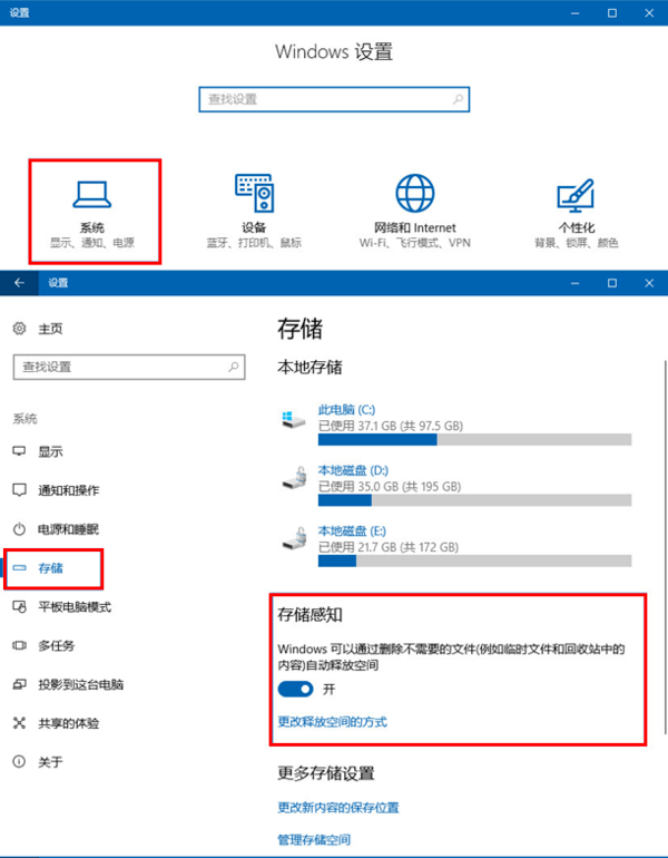 5、搜索并进入【存储】,【开启】“存储感知”。打开后,Windows便可通过删除不需要的文件(例如临时文件和回收站中的内容)自动释放空间。