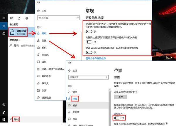 4、如果不需要应用使用广告ID、定位之类的功能,可以搜索进入【隐私设置】,关闭常规和位置中的相关选项。