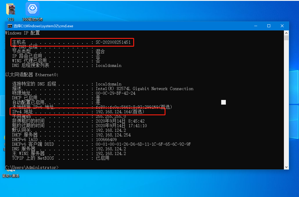 3、即可看到本机的ip地址信息。顺便记住主机名。