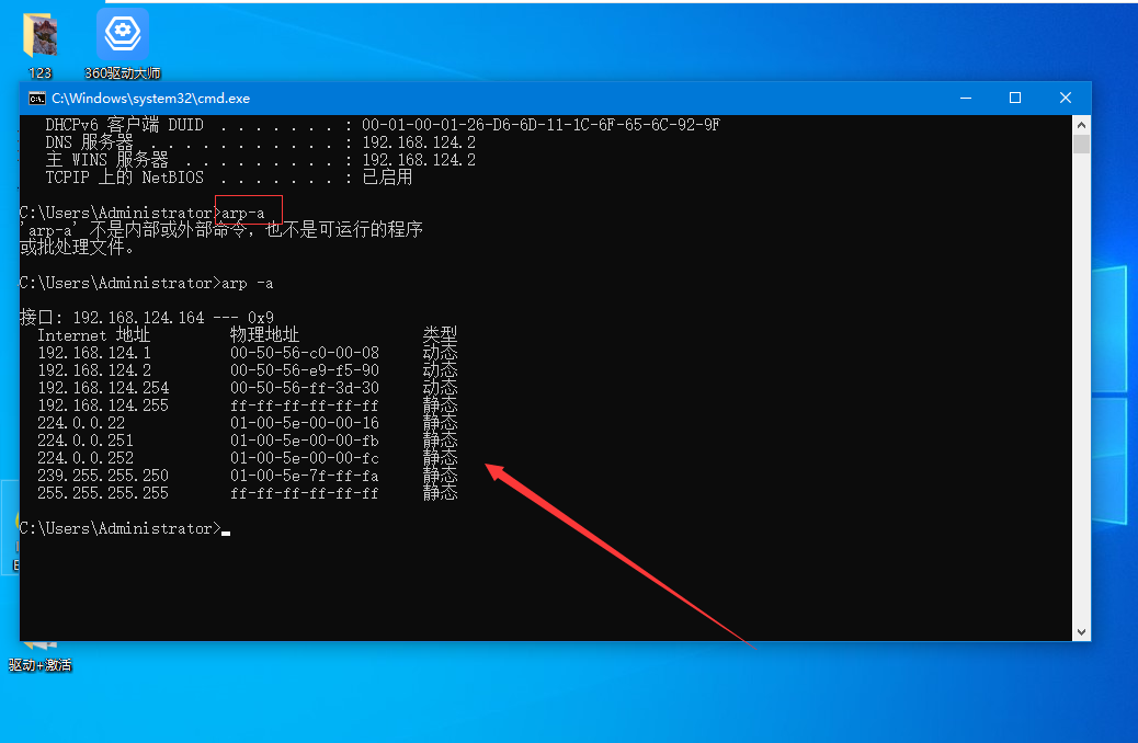 4、输入arp -a,回车确定。可以看到所有与本机通信的IP地址。