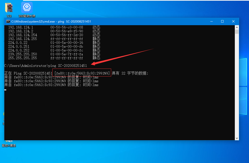 5、再次输入ping 主机名,回车确定,即可查看计算机的ip地址。