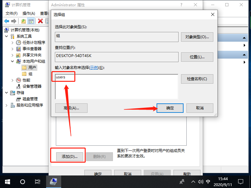 4、然后点击旁边的添加,输入users,点击确定,然后重启电脑即可。