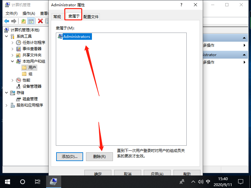 3、在隶属于中,如果只有下图的账户,我们将它删除。