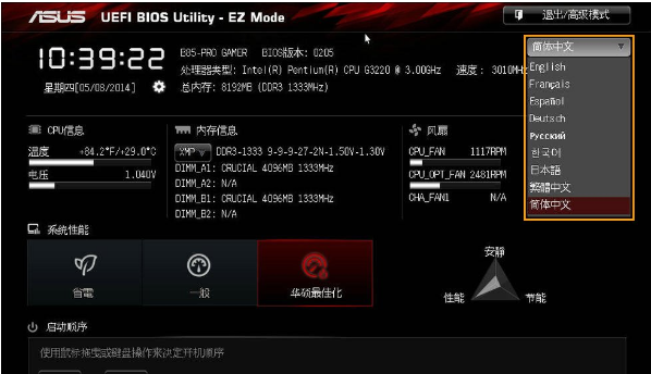 2、然后进入到华硕主板的BIOS界面后首先找到右上角的设置为简体中文,位置在右上角的下拉菜单中。