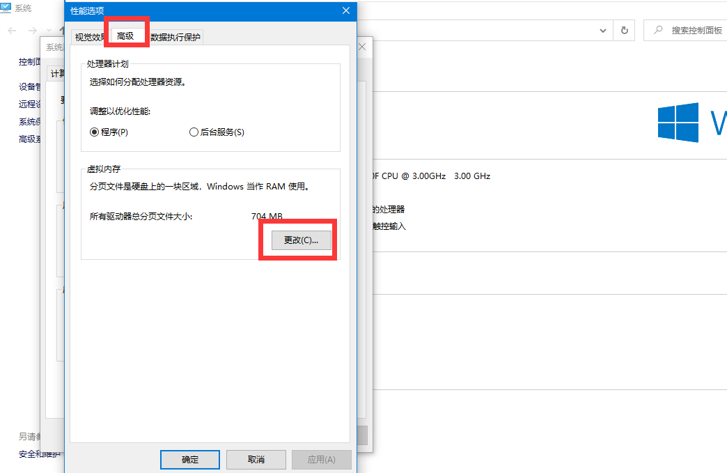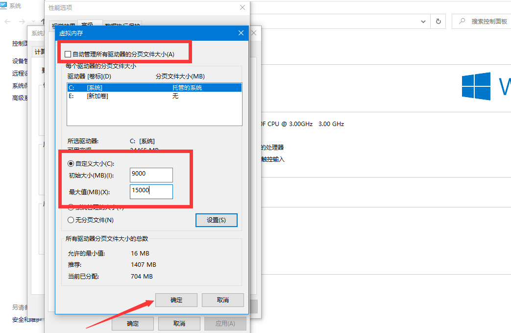8、点击高级选项,在虚拟内存中点击更改,取消勾选自动管理所有驱动器的分页文件大小,选择自定义,输入相应数值后,点击确定即可。