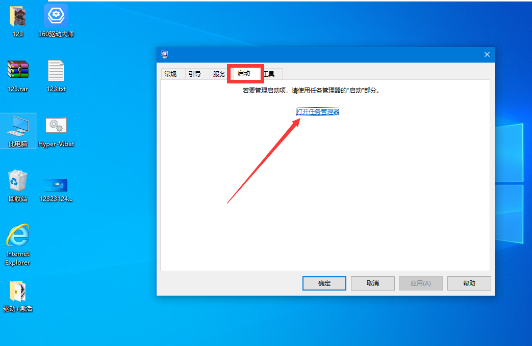 3、在弹出的窗口中,点击启动选项,再点击打开任务管理器。