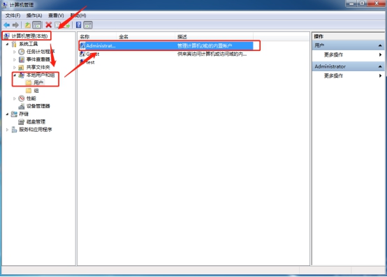 在计算机管理页中,打开“计算机管理”,再依次找到并打开“本地用户和组”文件夹以及“用户”文件夹。选择用户文件夹中的“Administrator”。