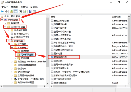 在新进入的组策略编辑器中,依次选择并打开“计算机配置”文件夹、“Windows配置”文件夹、“安全设置”文件夹、“本地策略”文件夹和“用户权利指分配”文件夹。