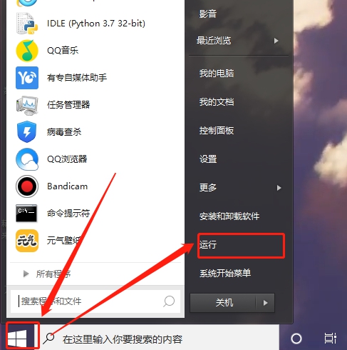 首先,使用组合键“win+R”打开运行页;或直接在屏幕左下方的微软图标上进入开始菜单,然后选择进入“运行”页。