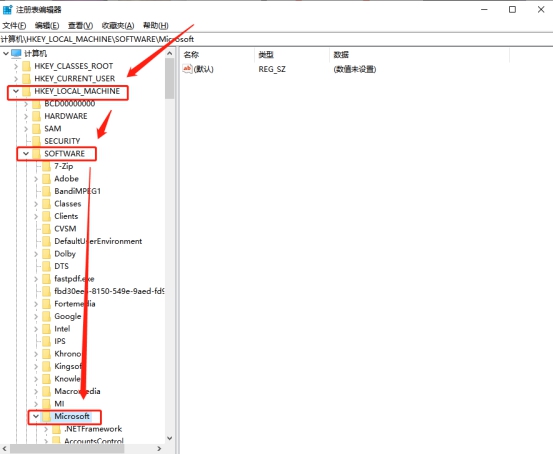进入注册表编辑器后,依次找到并打开“HKEY_LOCAL_MACHINE”文件夹、“SOFTWARE”文件夹和“Microsoft”文件夹。