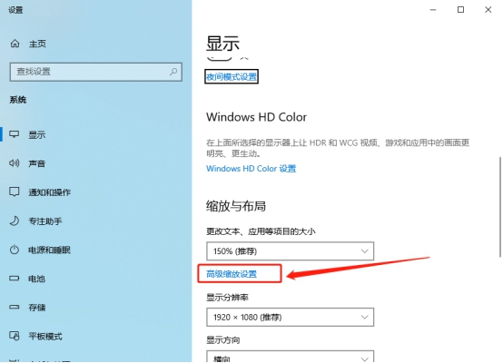 在设置中的显示页里,下拉找到“高级缩放设置”并点击进入。