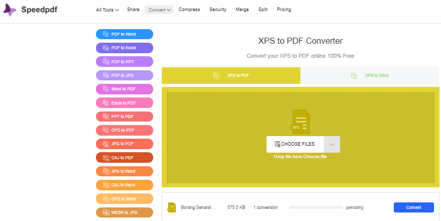 以上两种方法并不能保存每次都成功,所以我们还是需要借助转换工具,比如我们可以使用speedpdf这款在线转换工具,直接搜索进入工具首页后,选择XPS to PDF进入转换;