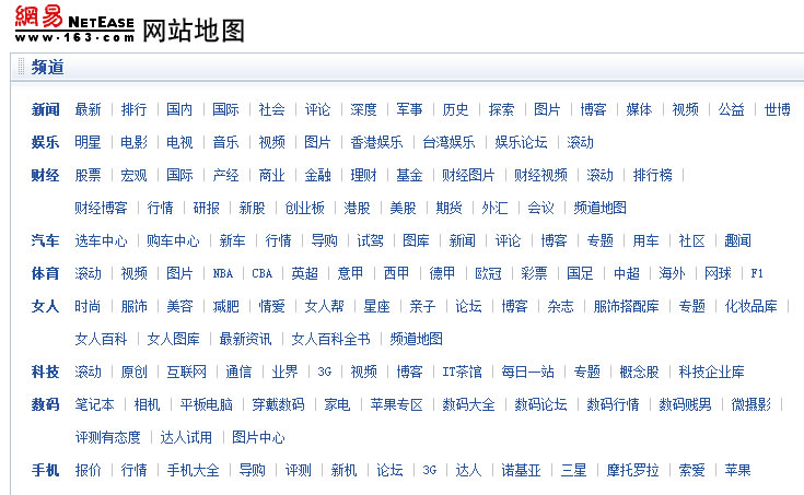 上图网易的HTML 地图,网易有太多重要的目录和页面了,在网站首页不可能有这么多空间来放这么多链接,即使全放到首页,用户体验也会非常糟糕,所以这个HTML地图对用户有很好的引导作用