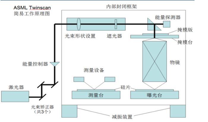 当时实际过程肯定没这么简单,上图是ASML典型的沉浸式步进扫描光刻机为例来看下光刻机是怎么工作的——首先是激光器发光,经过矫正、能量控制器、光束成型装置等之后进入光掩膜台,上面放的就设计公司做好的光掩膜,之后经过物镜投射到曝光台,这里放的就是8寸或者12英寸晶圆,上面涂抹了光刻胶,具有光敏感性,紫外光就会在晶圆上蚀刻出电路。