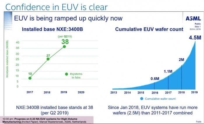作为全球唯一一家能EUV光刻机的厂家,ASML自然获得了大量的订单,截止至2019年第二季度,ASML的NEX:3400B EUV光刻机的装机数已经多达38台,而下半年他们推出了效率更高的NEX:3400C光刻机,而在2019年全年一共交付了26套EUV光刻机,为他们带来了27.89亿欧元的收入,占了全年收入的31%,而全年卖了82台的ArFi远紫外光光刻机才进账47.67亿欧元,可见一套EUV光刻机是多么的赚钱。