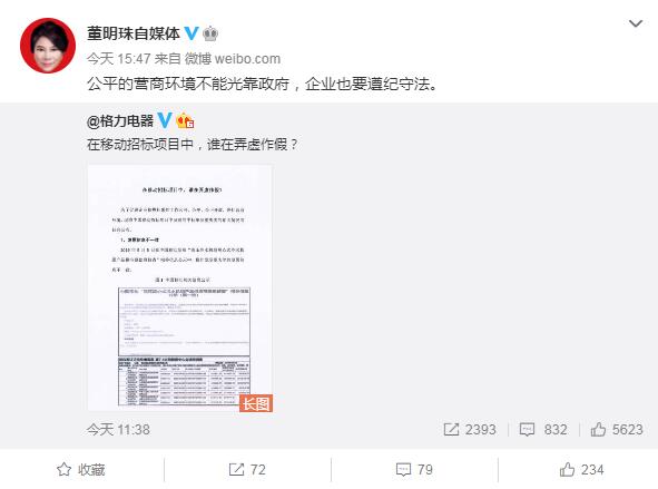 今日,针对“质疑美的弄虚作假”一事,@董明珠自媒体 转发了格力电器举报材料并评论称:“公平的营商环境不能光靠政府,企业也要遵纪守法。”
